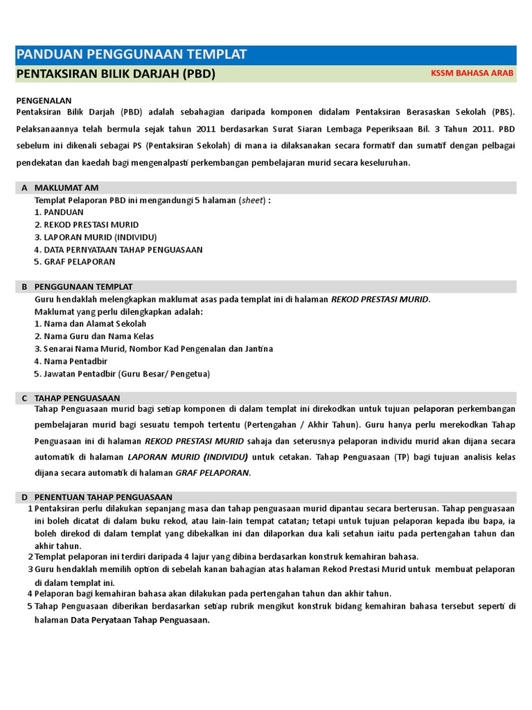 PANDUAN PENGGUNAAN TEMPLAT PENTAKSIRAN BILIK DARJAH PBD BAHASA. Templat Pelaporan PBD Tingkatan 1 adalah sebahagian daripada komponen di dalam Pentaksiran Berasaskan Sekolah PBS Tingkatan 1. PBD Tahun 1 versi 3 kssr semakan.
